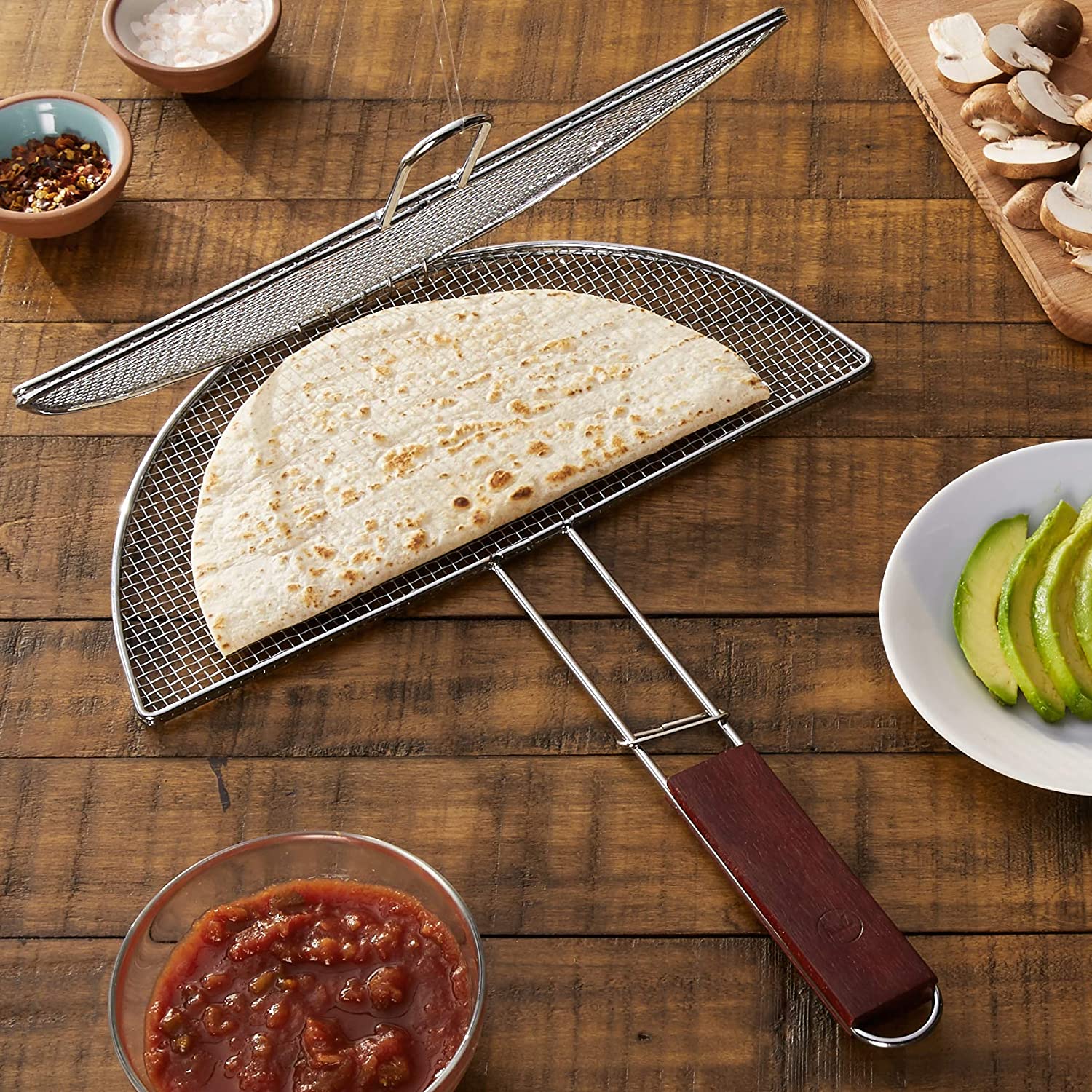 Grill up your quesadillas over the bbq with this cool tool. It has an easy sliding mechanism locking food into place so they can easily be flipped and transported.