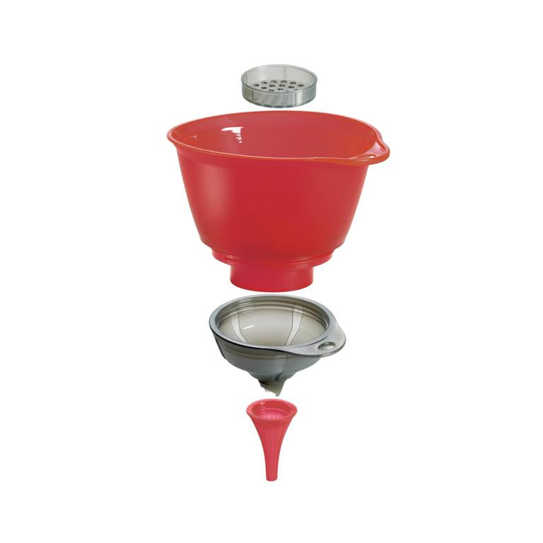 Comes apart into three specialized funnels to handle any size job in the kitchen. Small funnel for spices and cruets. Medium funnel with unique spout for filling hard-to-fill salt and pepper mills. Plus a wide-mouth funnel for canning preserves, with a strainer.
