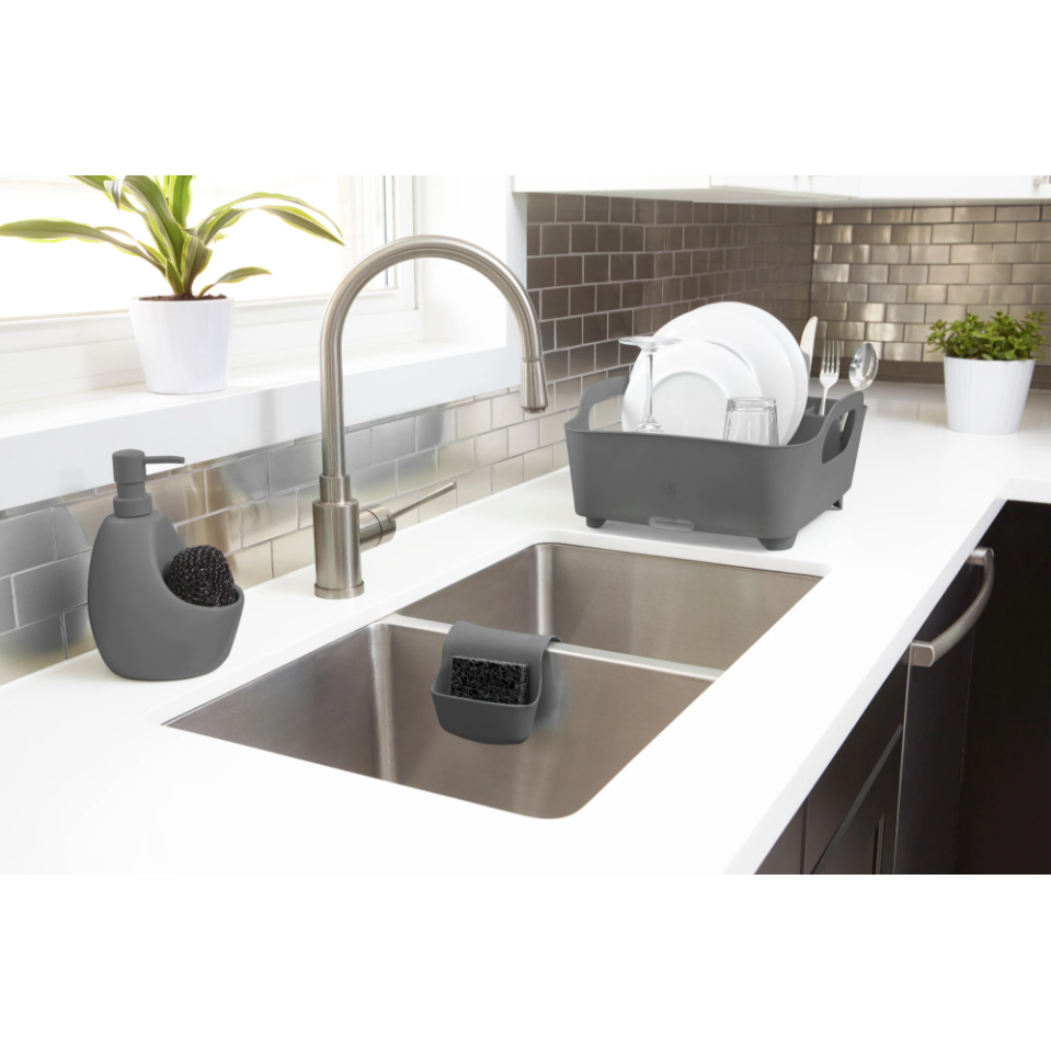 With easy grip handles, self-draining spout and built-in utensil holder, it holds various dish sizes and can sit in, or out, of the sink.