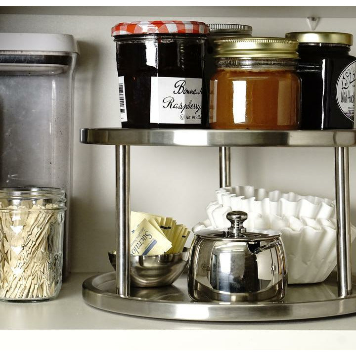 durable brushed stainless steel two tiered lazy susan. It rotates freely on smooth steel ball bearings maing everything easily within reach.
